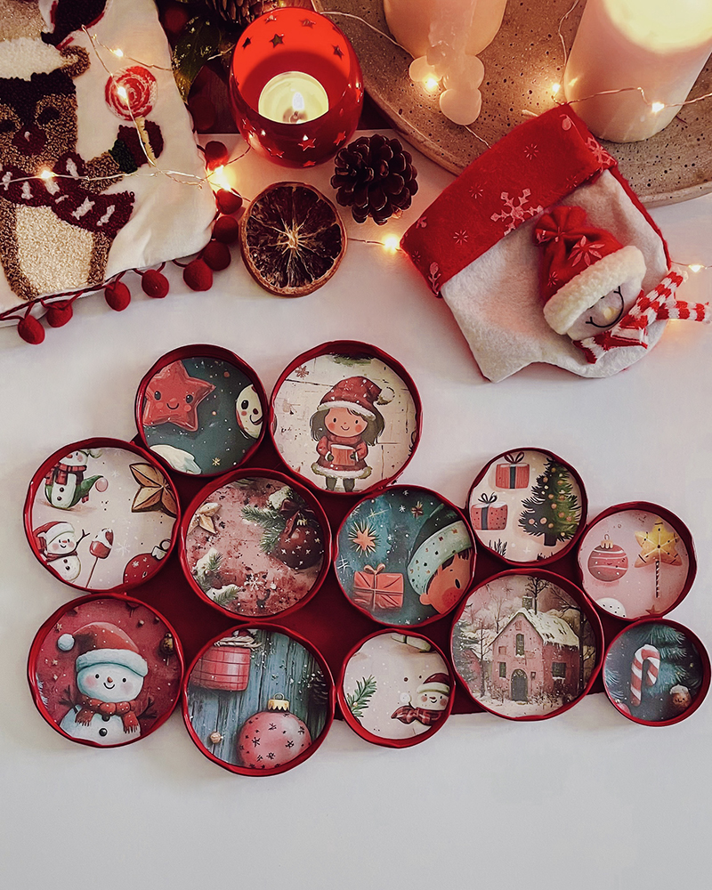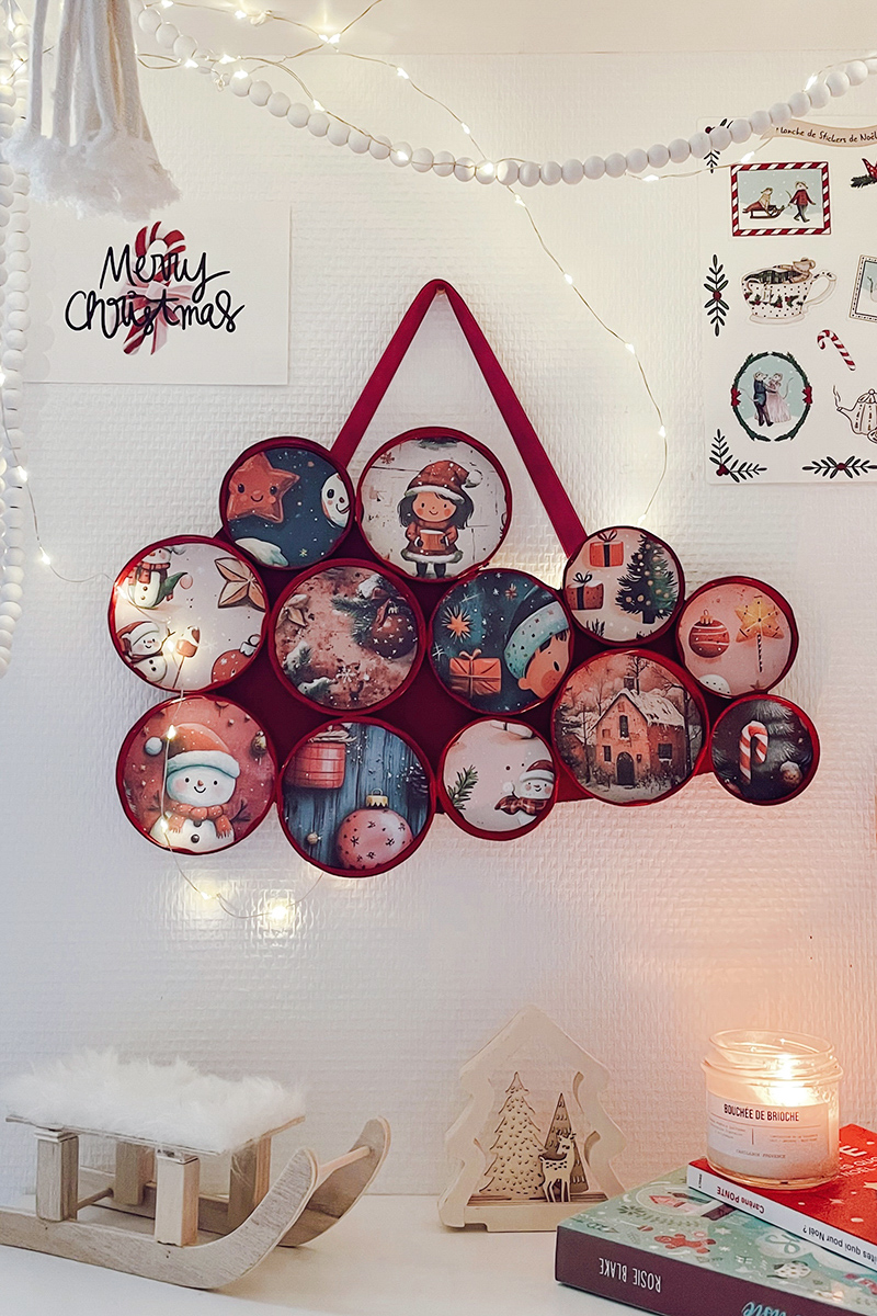 Décoration murale de Noël réalisée avec des couvercles recyclés et papiers illustrés