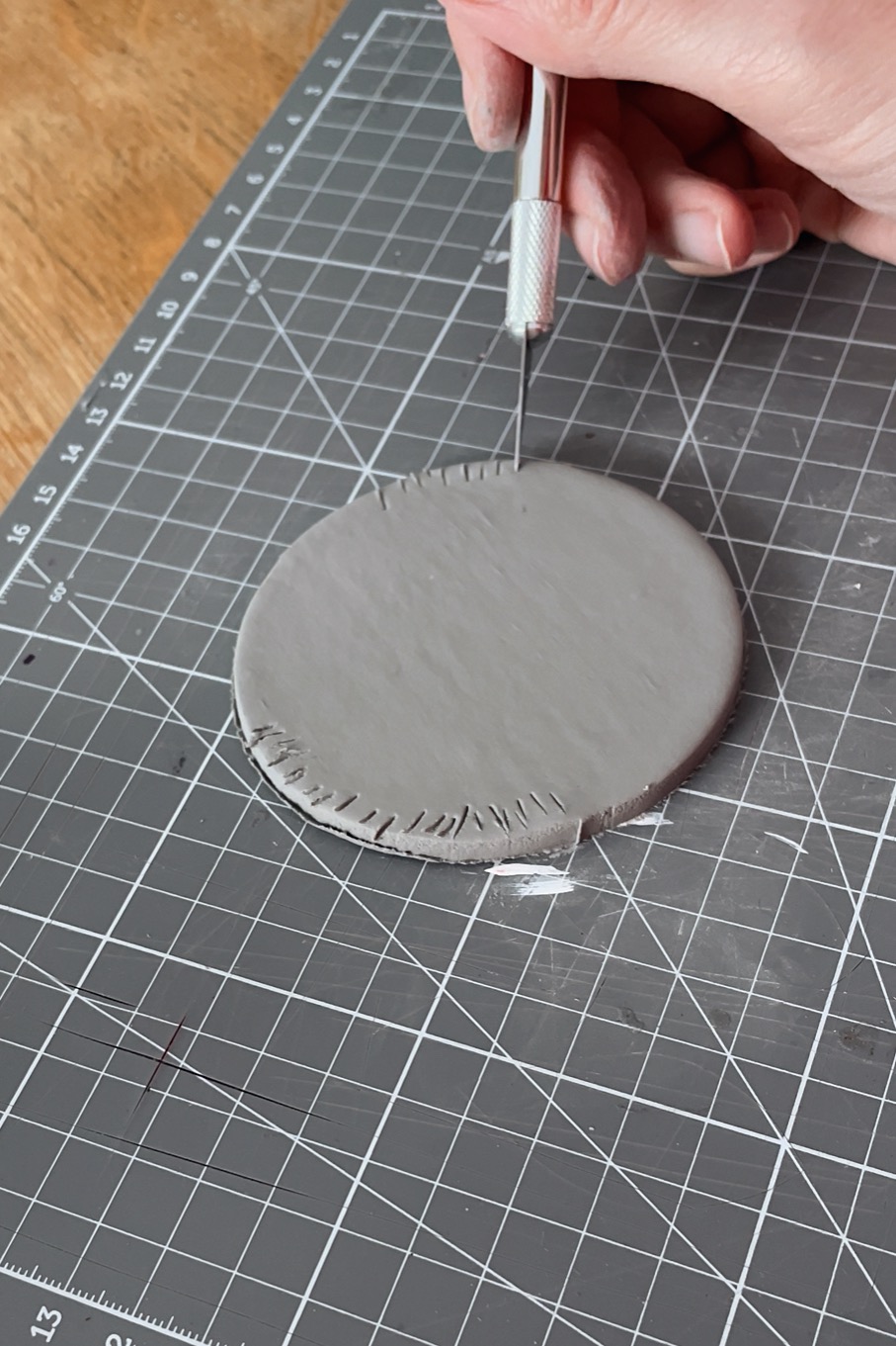 À l’aide d’un emporte-pièce rond (ou d’un verre), découpez des cercles d’environ 7 à 8 cm de diamètre dans l’argile étalée.