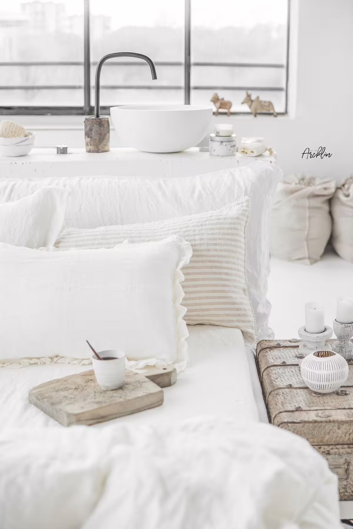 Pour créer une atmosphère estivale avec du blanc, la première étape est de peindre ses murs de cette même teinte. Elle va apporter cette fraîcheur rechercher et va agir comme une toile vierge où l’inspiration va se mettre en marche. Les murs blancs vont permettre de faire ressortir nos meubles et accessoires déco. Il existe une jolie palette de nuances de blanc (blanc de lin, coquilles d’oeuf, crème,..). À vous de voir si vous préférez des tonalités chaudes ou froides. Vous pouvez également opter sur l’option monochrome, un parti pris sur lequel vous pourrez jouer avec les différentes nuances de blancs.