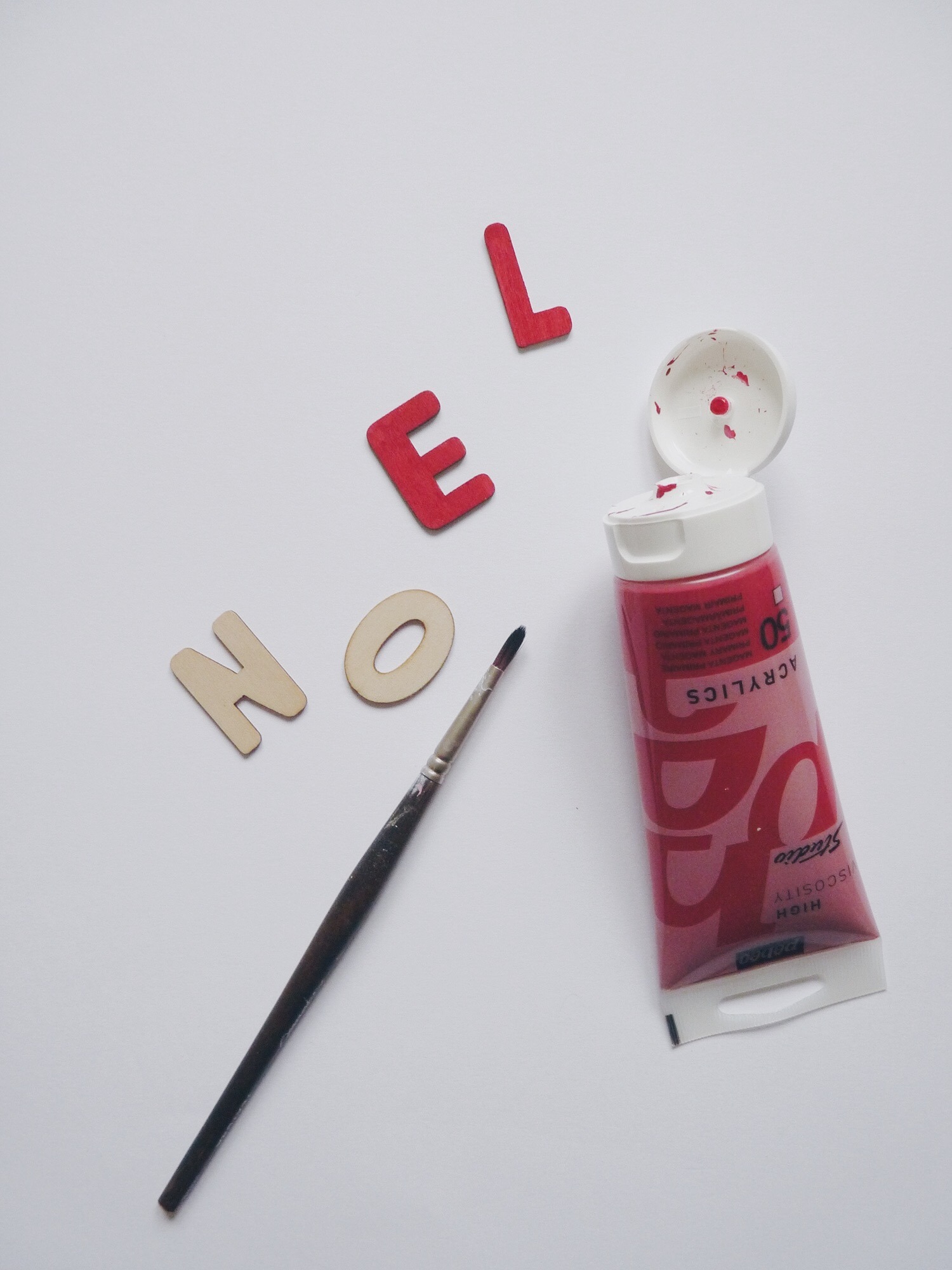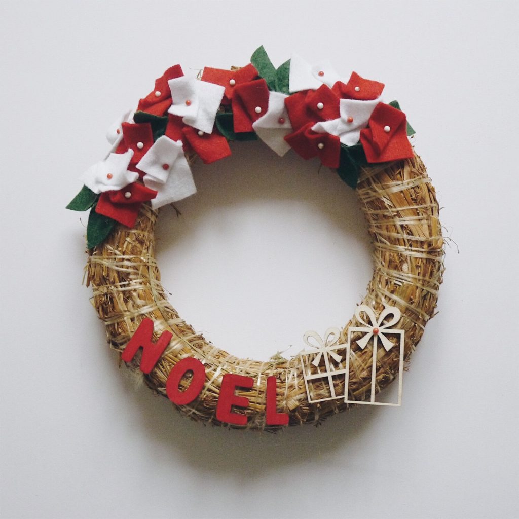 Vous pouvez retrouver le pas à pas des fleurs en feutrines par ici. Collez les fleurs et peignez les lettres en rouge. Une fois sèches, fixez-les au pistolet à colle et ajoutez les décorations.